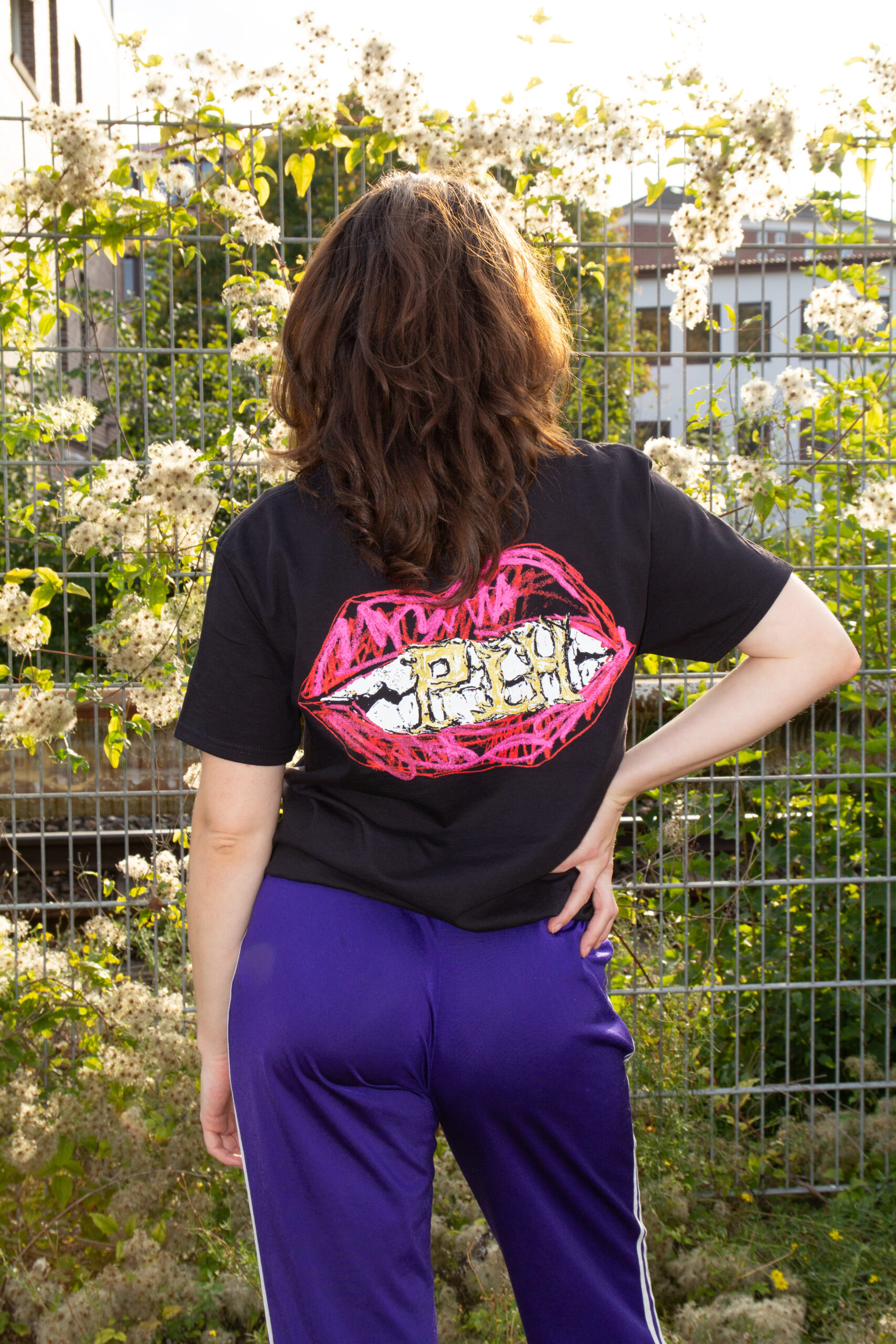 Zähne glitzern – das PLH GRILLZ Shirt bringt einen knalligen Backprint von Annemo auf den Rücken: ein knalliger Mund in pink und rot, der Zähne zeigt – inklusive goldener Grills.